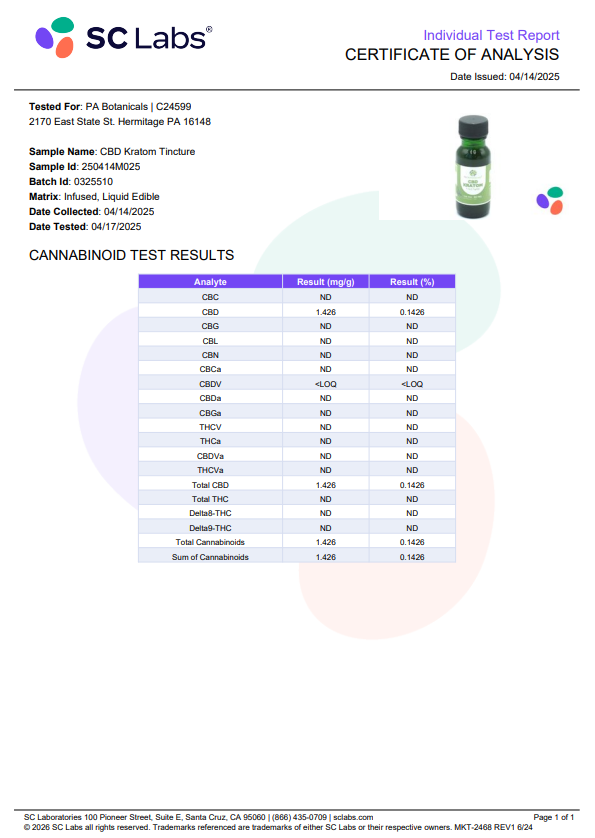 Embark on a journey of well-being with our CBD Kratom Tincture – where the simplicity of nature meets the effectiveness of science. Elevate your daily routine and embrace a balanced lifestyle with the power of CBD and Kratom combined. Each bottle contains 120mg Total Kratom Alkaloids and 50mg CBD!